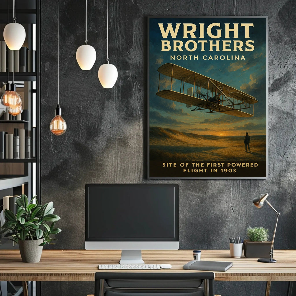 - Printed with precision and made to inspire, this artwork is more than decoration—it’s a conversation piece that connects history, culture, and style. Bring Wright Brothers First Powered Flight into your home, classroom, or office today and let your walls tell a powerful story.