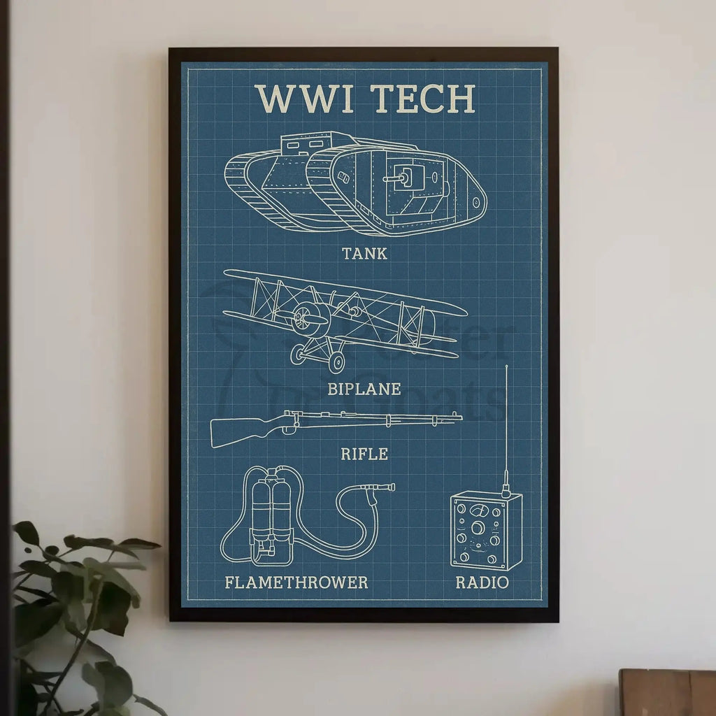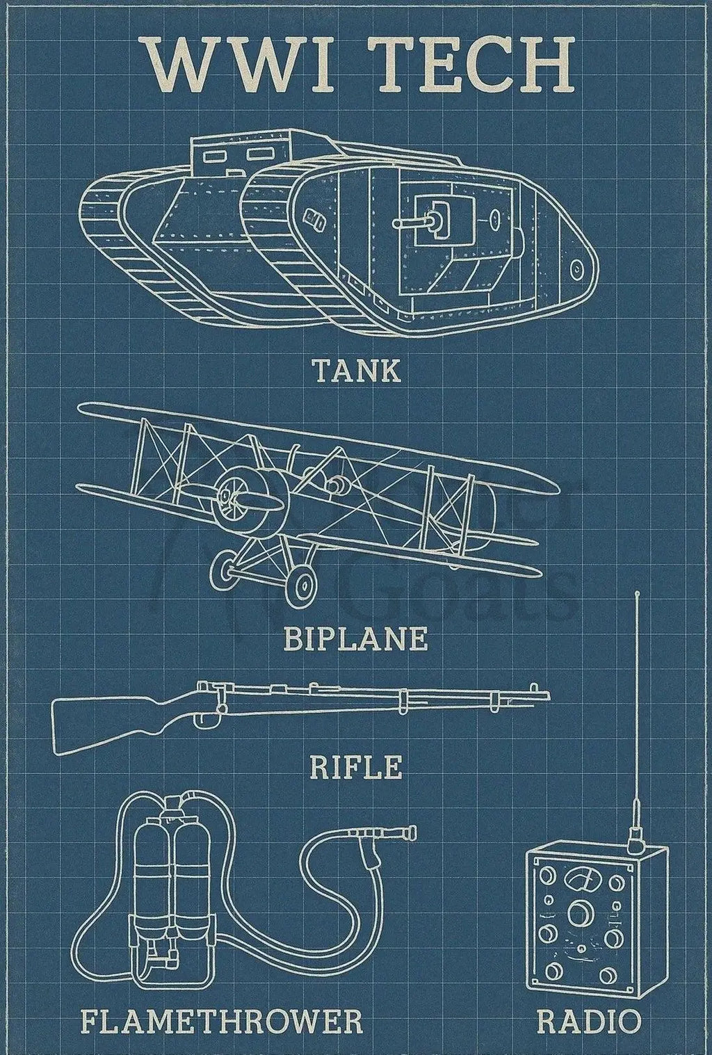Capture the ingenuity of the Great War with the WWI Technology Schematic Art Print Historical Poster from PosterGoat. This 18x24 poster presents precise, vintage-style line drawings on a classic blueprint grid — a minimalist, educational piece that highlights iconic WWI machines like the tank, biplane, rifle, flamethrower and field radio.