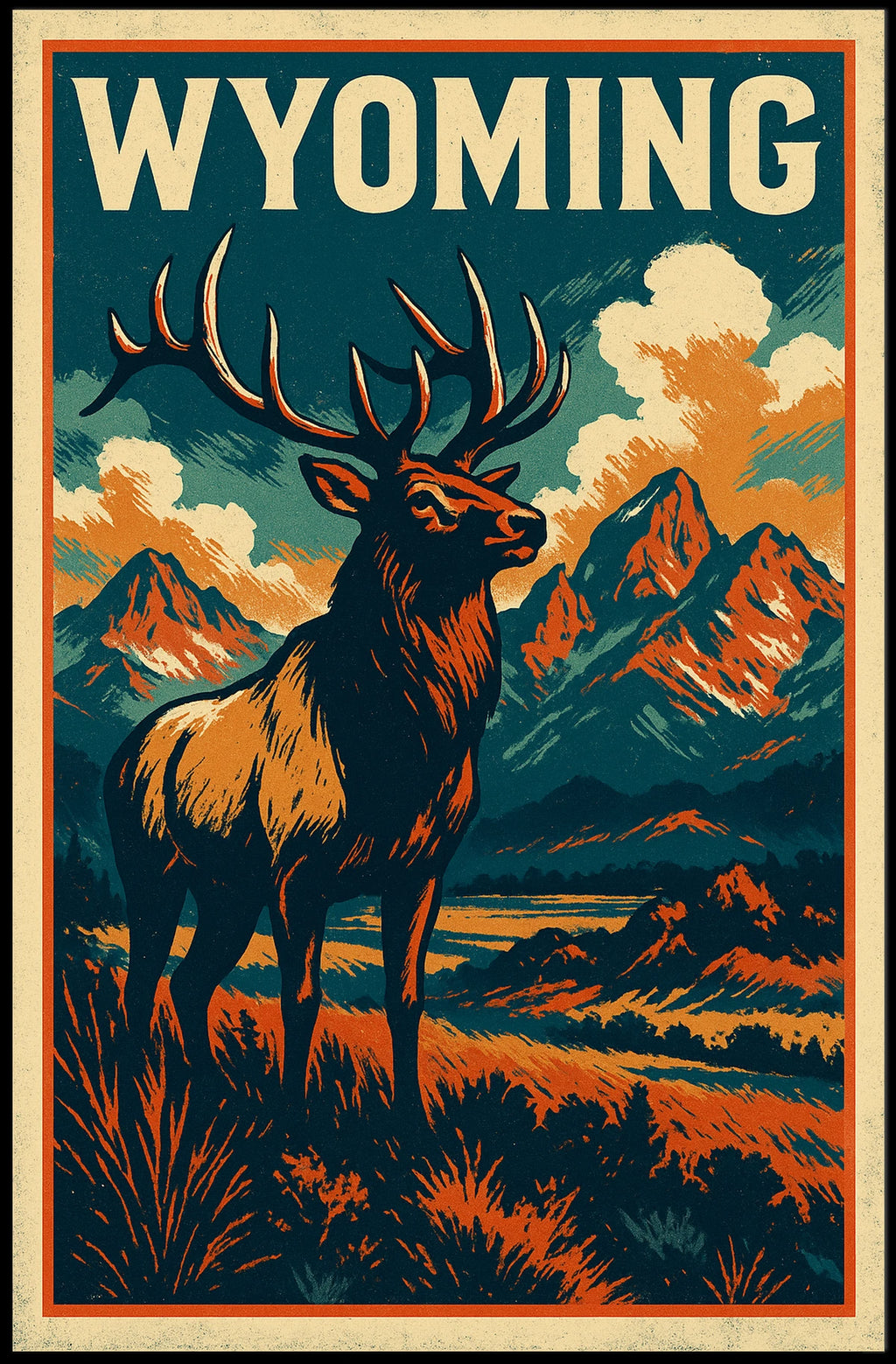 Detailed design highlighting Wyoming’s rugged landscapes, expansive skies, and iconic wilderness scenes