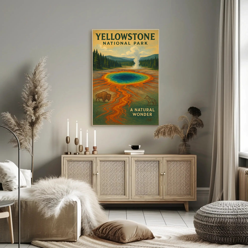 Bring the awe of America's first national park into your home with the Yellowstone National Park — A Natural Wonder Poster from PosterGoat. This vintage-inspired art print captures the steaming geyser, the vivid concentric rings of the hot spring and the surrounding pine ridgeline in rich, painterly detail. Warm ochres, deep forest greens and a striking turquoise core create a timeless focal point that complements modern and minimalist interiors.