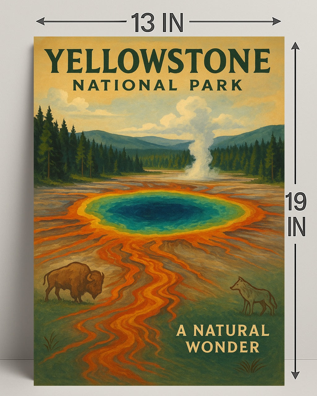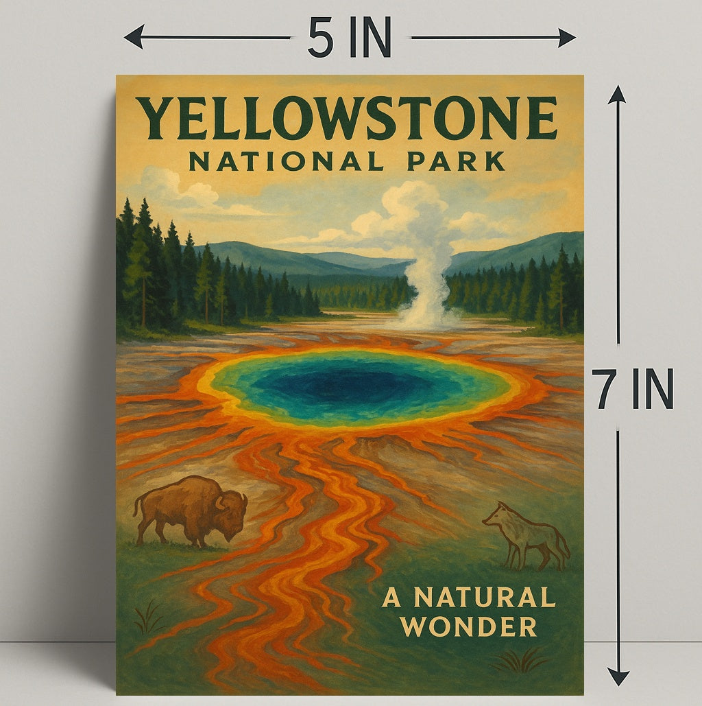 - Iconic imagery: A bold illustration of Yellowstone’s geothermal wonder with a bison and wolf silhouette for an authentic park feel.
