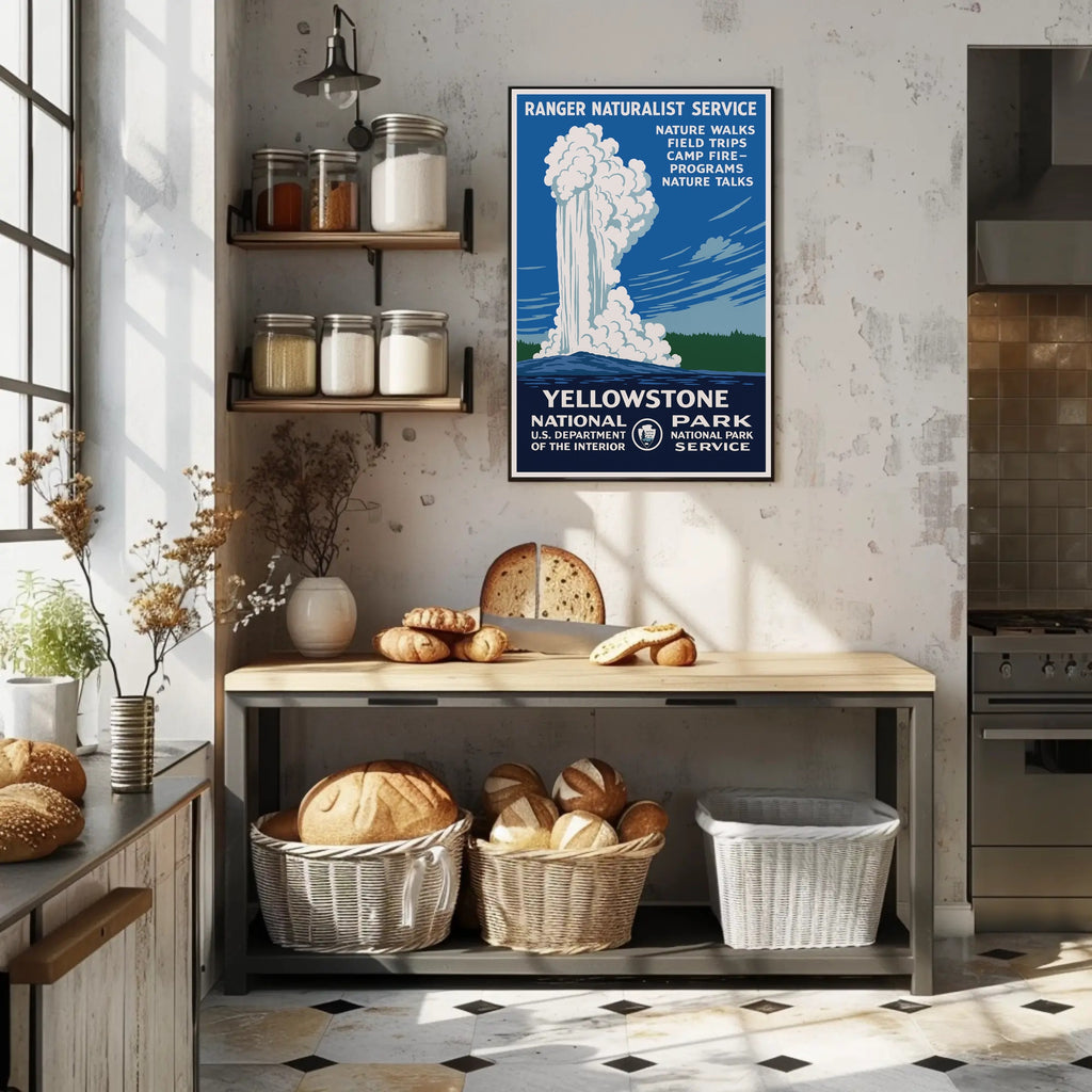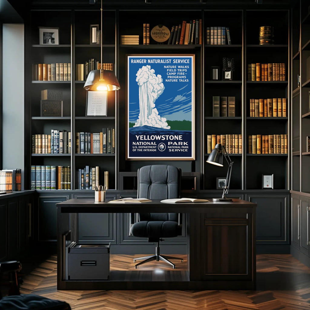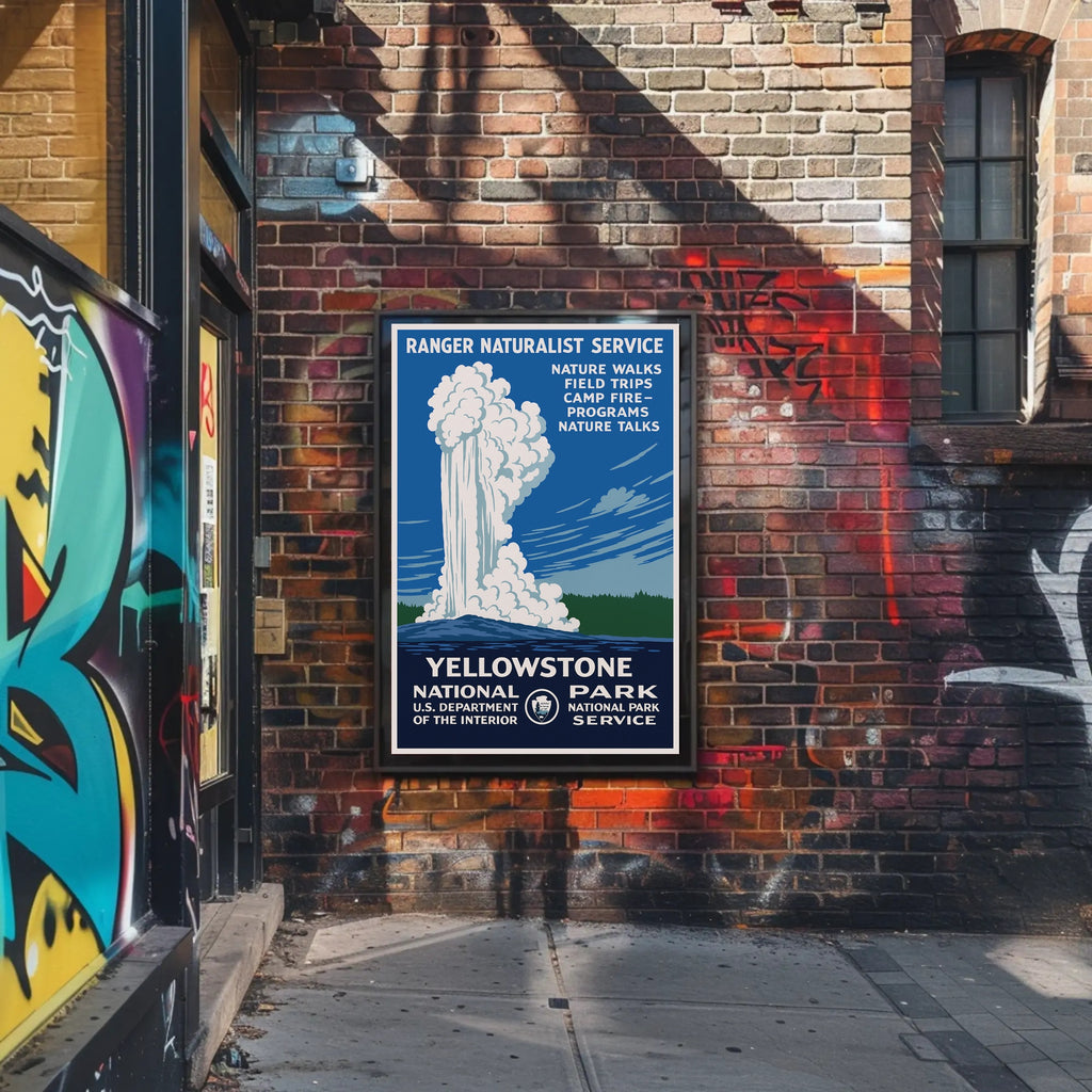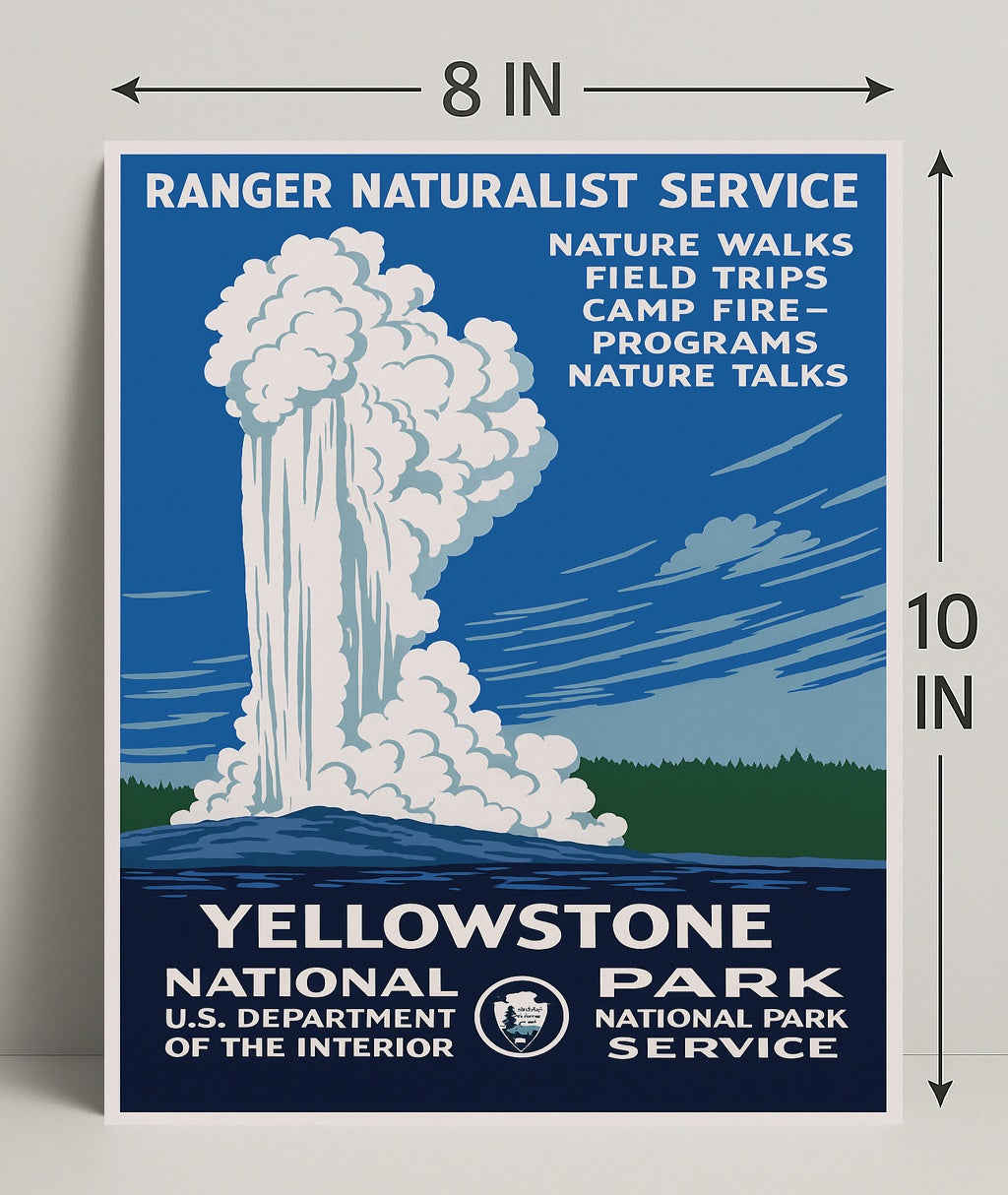 Bring the spirit of Yellowstone into your home with the Yellowstone National Park Ranger Naturalist Service Poster from PosterGoat — a vintage-inspired art poster that captures the geyser’s towering plume in clean, minimalist graphics and a bold blue palette.