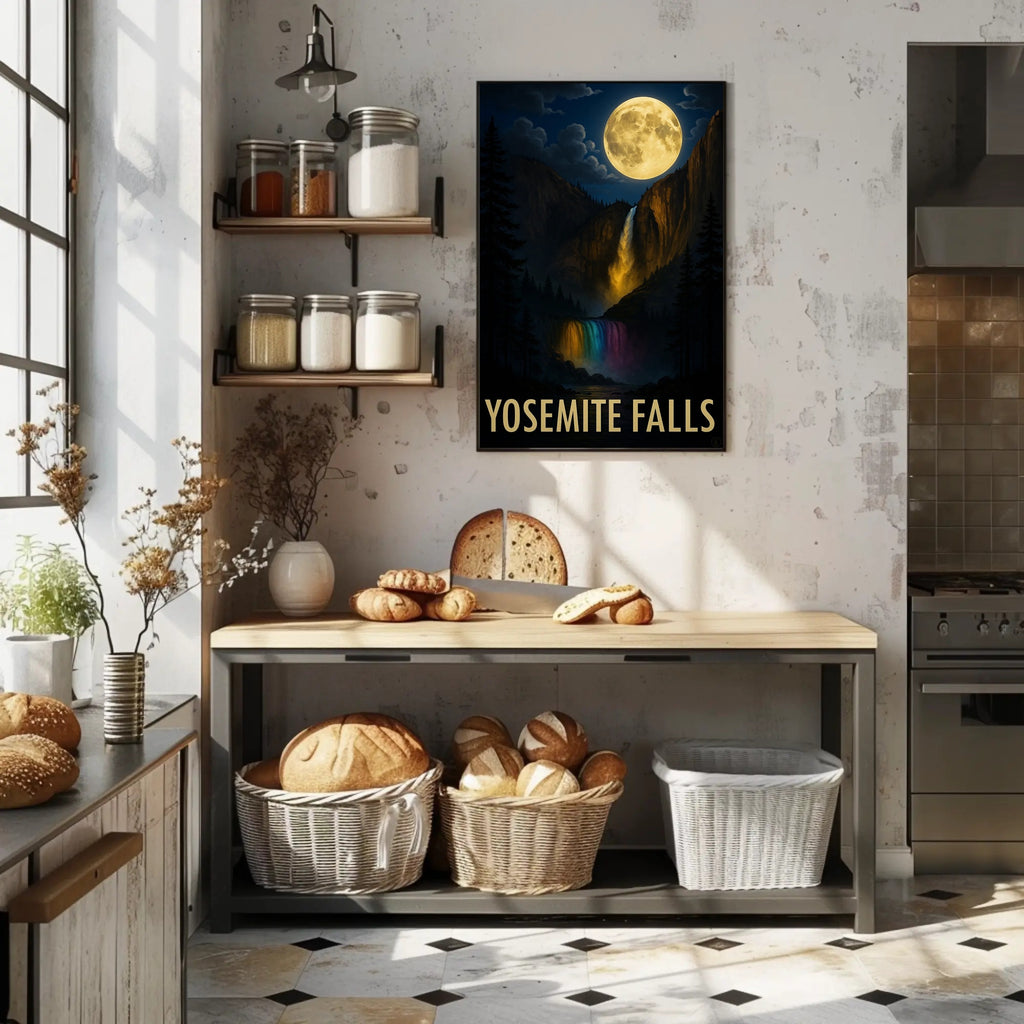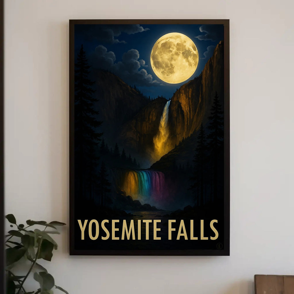 Experience the breathtaking grandeur of Yosemite Falls under a radiant full moon, where photorealism meets surrealism. This poster beautifully portrays the waterfall's majestic descent, illuminated by the moonlight, creating an ethereal glow. The vibrant colors of the cascading waters, reminiscent of a rainbow, enhance the fantastical quality of the landscape. Framed by the dark silhouettes of towering trees and rugged cliffs, this poster evokes a sense of natural tranquility and awe. Perfect for nature enthusiasts and art lovers alike, this masterpiece captures the untamed beauty of Yosemite, making it an exquisite addition to any space.