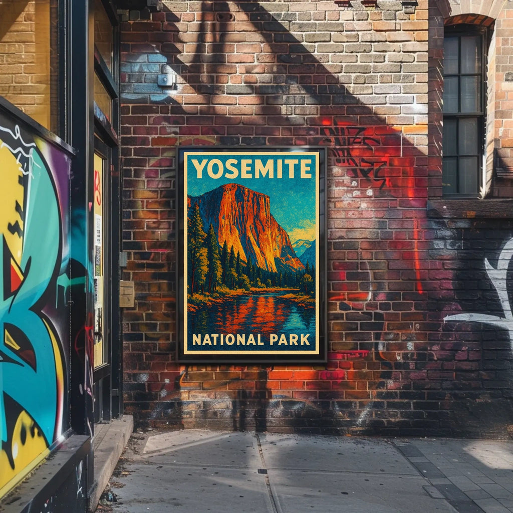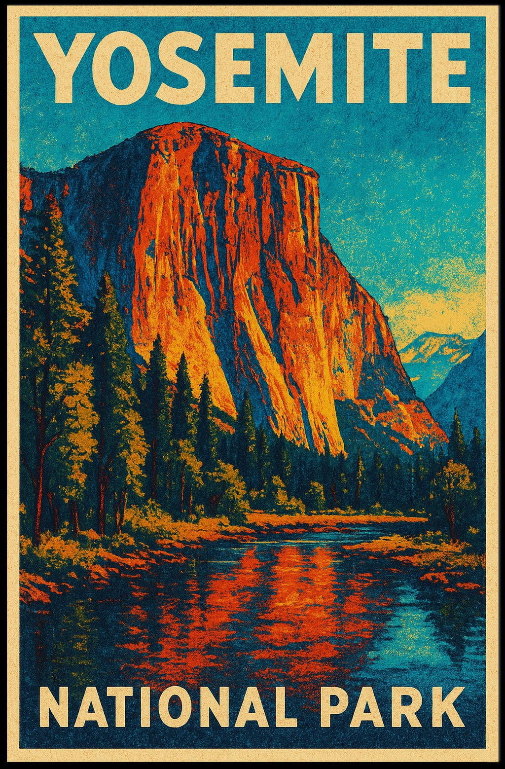 Celebrate the beauty of Yosemite National Park with the Yosemite Vintage Adventure Poster: El Capitan Landscape. This vintage-style poster features the iconic El Capitan, capturing the majestic rocky mountain landscape with a serene, reflective river at its base. Framed by towering cliffs and lush evergreen forests, it evokes a sense of adventure and tranquility. Inspired by mid-20th-century travel posters, the vibrant colors of orange, blue, and green evoke nostalgia and invite exploration. Perfect for nature lovers and adventurers, this poster adds a touch of grandeur and inspiration to any space.