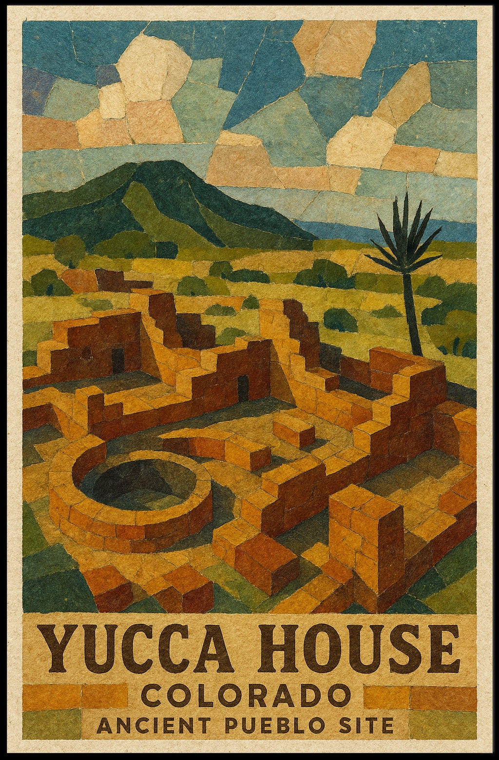 Detailed design highlighting the canyon textures, kiva-like architecture, and scenic silhouette of Yucca House Ancient Pueblo Site