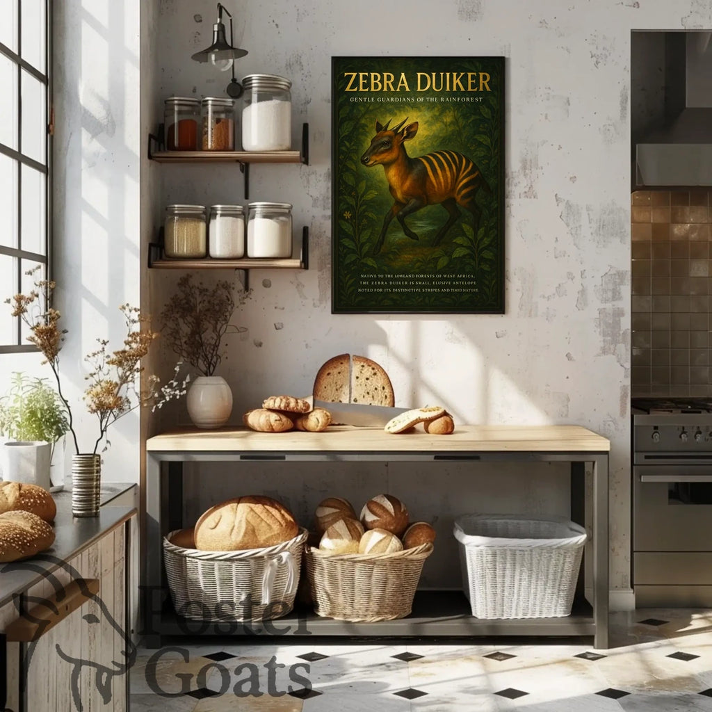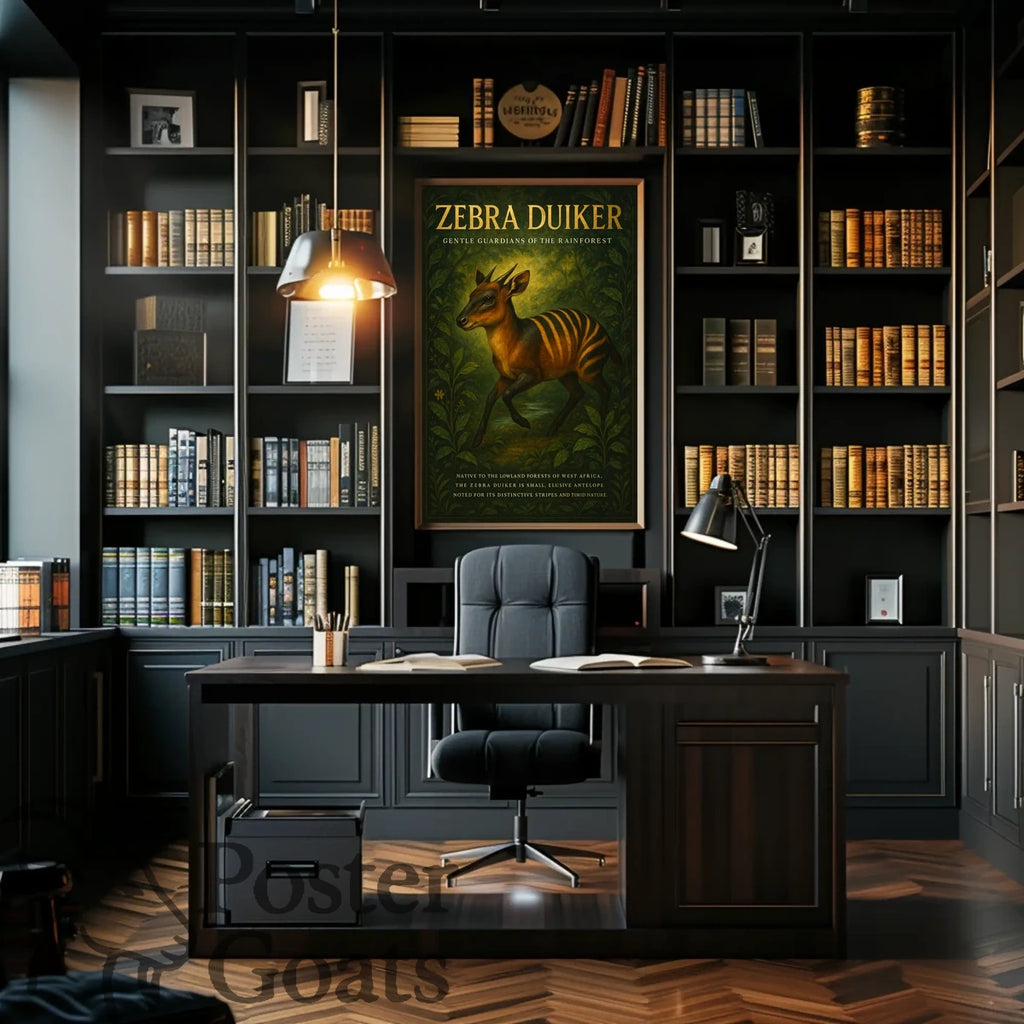 This captivating poster brings the enchanting Zebra Duiker to life, an antelope species native to West Africa's lush lowland forests. Capturing the creature mid-stride, the illustration emphasizes its unique stripes, set against a backdrop of vibrant green foliage that evokes a serene, rainforest atmosphere. The artwork blends naturalism with a vintage illustration style, echoing classic wildlife art traditions. The piece is both visually stunning and educational, imparting a message of conservation through its "Gentle Guardians of the Rainforest" tagline. Perfect for wildlife enthusiasts, this poster combines aesthetic beauty with an informative narrative.