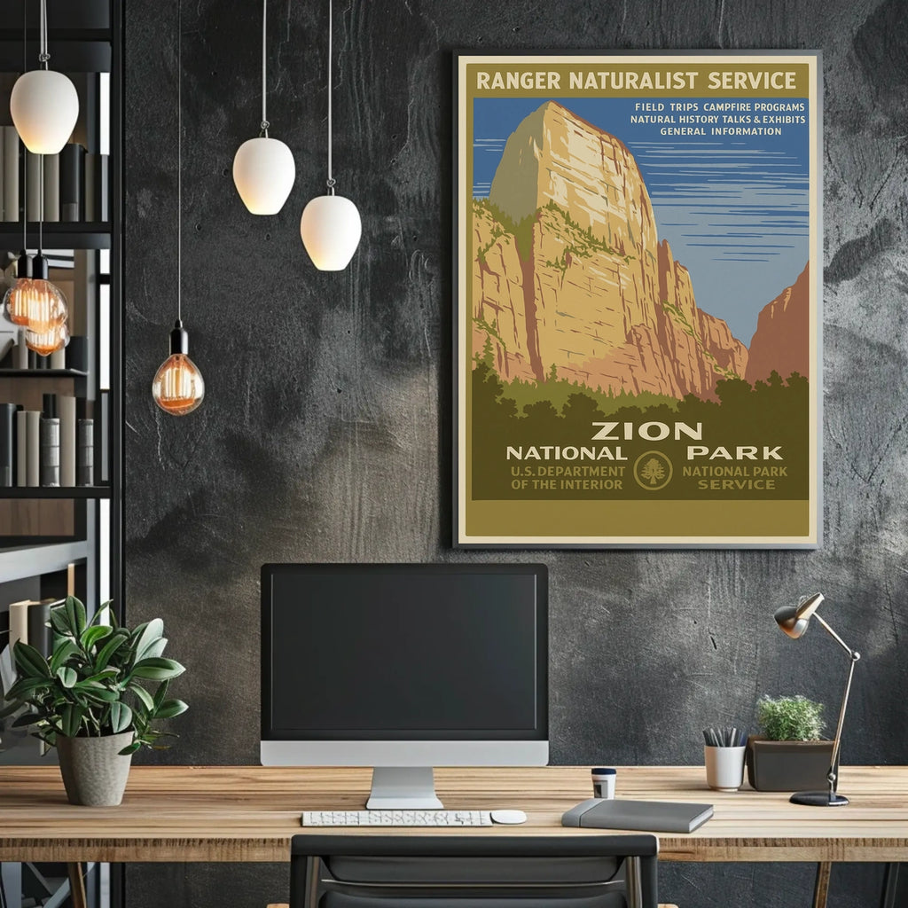 Bring the awe of Zion National Park into your home with this Ranger Programs Poster. Designed for decor lovers and wanderlust spirits, the art print captures the park's rugged beauty and the spirit of its ranger programs, turning any wall into an invitation to explore.